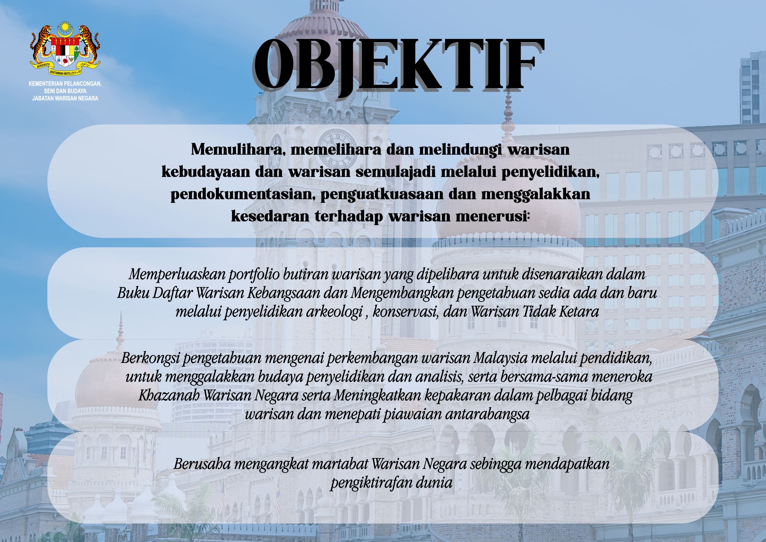 Bertanggungjawab memelihara dan mengekalkan warisan negara seperti yang termaktub di dalam Akta Warisan Kebangsaan 2005. Skop Warisan Jabatan Warisan Negara Englshdaba. PEMULIHARAAN WARISAN KEBUDAYAAN MELALUI SISTEM TAGAL SUNGAI DI SABAH.